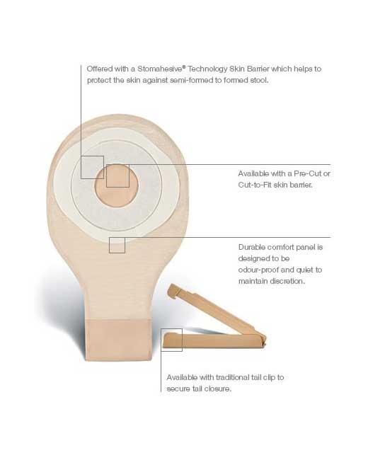 - Offered with either a Stomahesive Skin Barrier which helps to protect the skin against semi-formed to formed stool or Durahesive Plus Skin Barrier which helps to protect the skin against for semi-liquid to liquid stool - Available with presized or cut to fit skin barrier - Durable comfort panel is designed to be odor-proof and quiet to maintain discretion - Available with traditional tail clip to secure tail closure